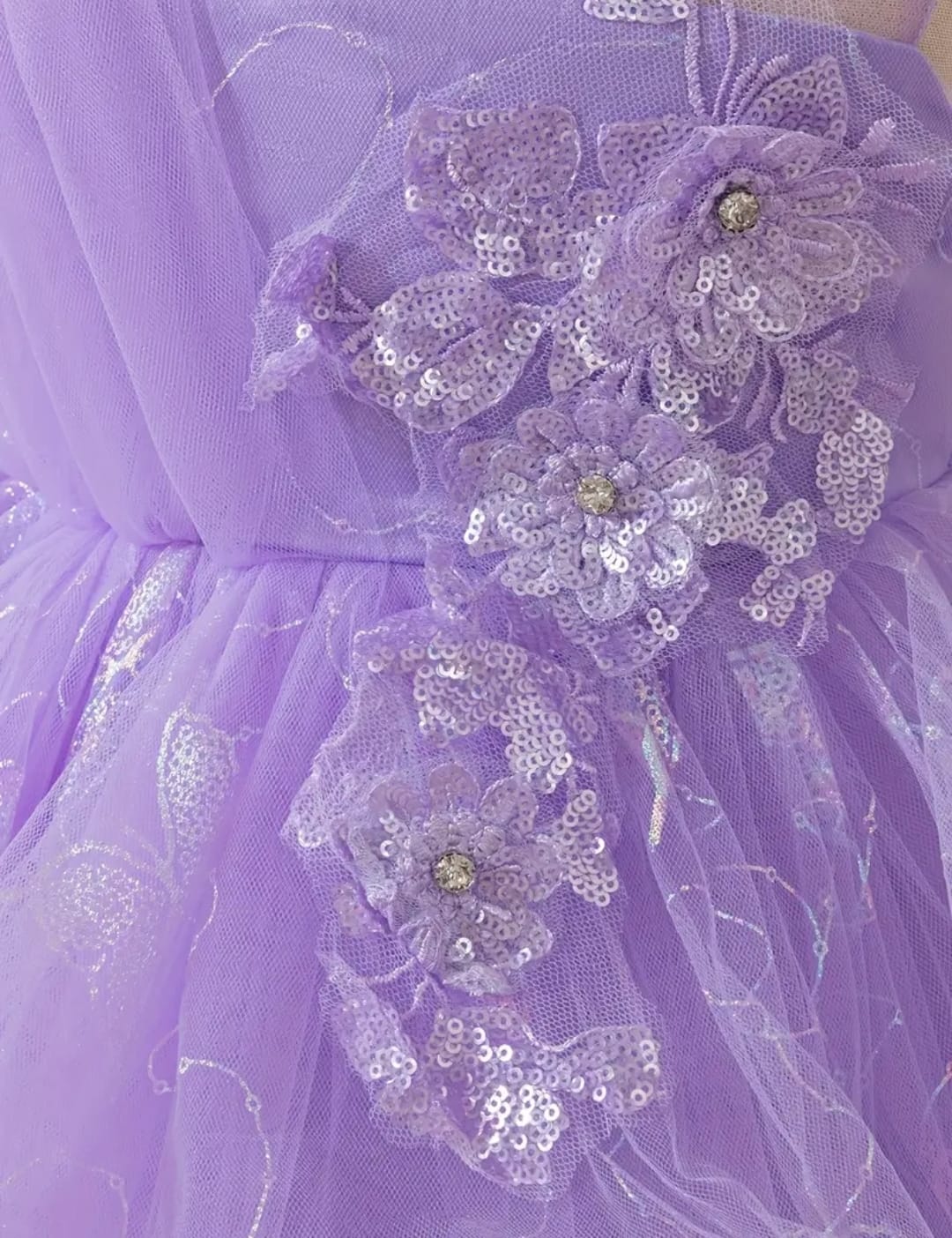 La parte superior del vestido podría estar adornada con delicados bordados o lentejuelas brillantes que capturan la luz y la mirada de todos.